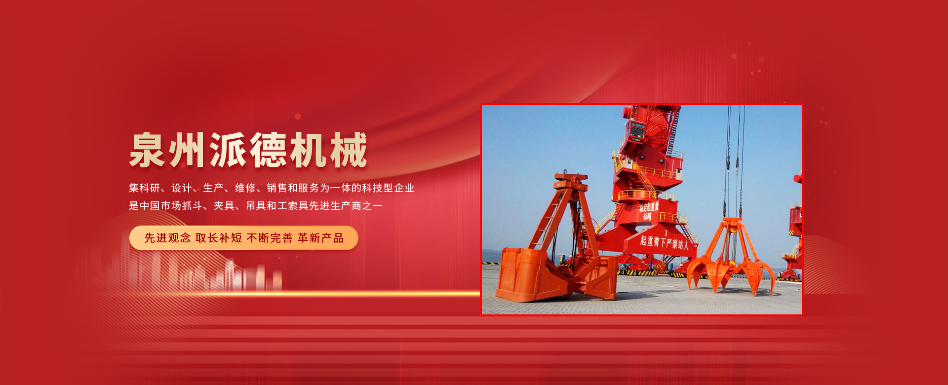泉州派德機(jī)械有限公司成立于2012年5月,位于全國(guó)文明的古城福建泉州,公司擁有各類型專業(yè)員工82人,其中高級(jí)工程師1人,工程師4人,助理工程師5人,是一家集科研、設(shè)計(jì)、生產(chǎn)、維修、銷售和服務(wù)為一體的科技型企業(yè),是中國(guó)市場(chǎng)抓斗、夾具、吊具和工索具先進(jìn)生產(chǎn)商之一。產(chǎn)品采用國(guó)內(nèi)外先進(jìn)的設(shè)計(jì)方案、技術(shù)規(guī)范、制造過程、工藝流程和服務(wù),憑借在抓斗、夾具、吊具和工索具領(lǐng)域的超前設(shè)計(jì)理念和成熟的技術(shù)、工藝和管理,在抓具領(lǐng)域迅速崛起。
